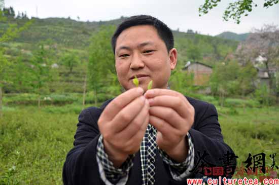 达州万源茶业局局长刘明亮给记者直观的展示巴山雀舌鲜叶