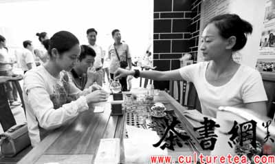 图为市民在第二届海阳绿茶推介会上品茶。