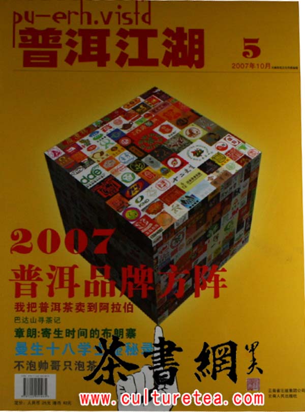每月15日面市理念:高端、时尚、专业、品味风格:144页,国际流行开本,图文并茂,全彩,157克铜版纸印刷。多维视觉,新闻性、娱乐性并行,现实性与服务性并重,精英性与大众性并存,一本开放、包容、权威的普洱茶时尚完全读本。发行:依托四川尚和文化发展有限公司、四川尚和书店-全国连锁发行机构的优势,覆盖全国报刊亭、大型超市、机场、从云南几大普洱茶产区到全国普洱茶消费大省及主要城市,具体为昆明、广州、深圳、东莞、北京、济南、上海、成都、长沙、西安、南京、武汉、大连、青岛、台湾、香港等。受众:25岁以上的普通消费者、政府官员、小资、都市白领、茶叶生产商、经销商等。销售点:全国城市报刊亭、新华书店、商场、便利店、家乐福、沃尔玛超市、茶叶店、茶厂、酒店等。本期导读:2007普洱品牌方阵、我把普洱茶卖到阿拉伯、巴达山寻茶记、章朗:寄生时间的布朗寨、曼生十八学士壶秘录、不泡帅哥只泡茶。