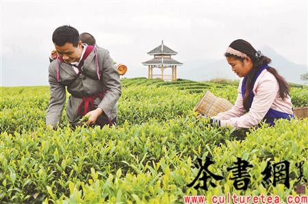 4月7日,广西三江县八江乡布央仙人山茶场云雾缭绕,村民们正忙着采摘清明茶。近年来,三江县狠抓“两茶一竹”特色富民产业,全力做大做强做精“三江春”茶叶品牌,采取“公司+基地+农户”经营模式,形成了龙头引领、协会助推、大户示范、全员共建的现代农业产业推进体系,全县现有的14.8万亩茶园已成为侗乡富民强县的“绿色银行”。2013年,三江县干茶产量达1.05万吨,茶叶总产值首破10亿元大关,成为名副其实的中国名茶之乡。龚普康 摄