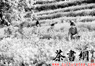 采茶姑娘在采摘碧螺春茶。